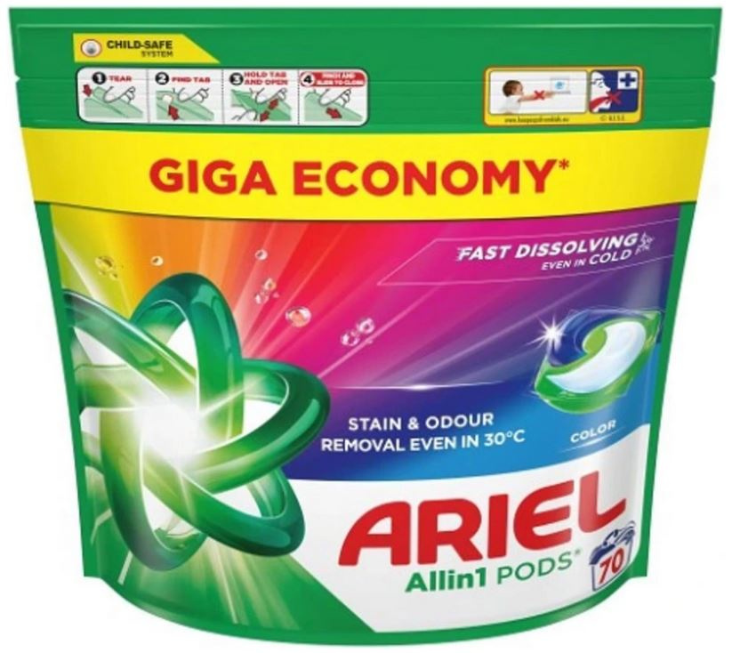 Ariel All-in-1 Color sú ideálne ako univerzálny prostriedok. S týmito kapsulami hravo vyperiete všetko, pretože obsahujú účinné zložky pre všetky materiály bielizne. Škvrny odstráni počas prania, bez namáčania vopred. Kapsuly na pranie Ariel sú ideálnou voľbou pre bežnú údržbu. Vzhľadom na zloženie je pre ne zachovanie intenzity vašej bielizne hračka. S týmito kapsulami budete schopní prať farebnú bielizeň.