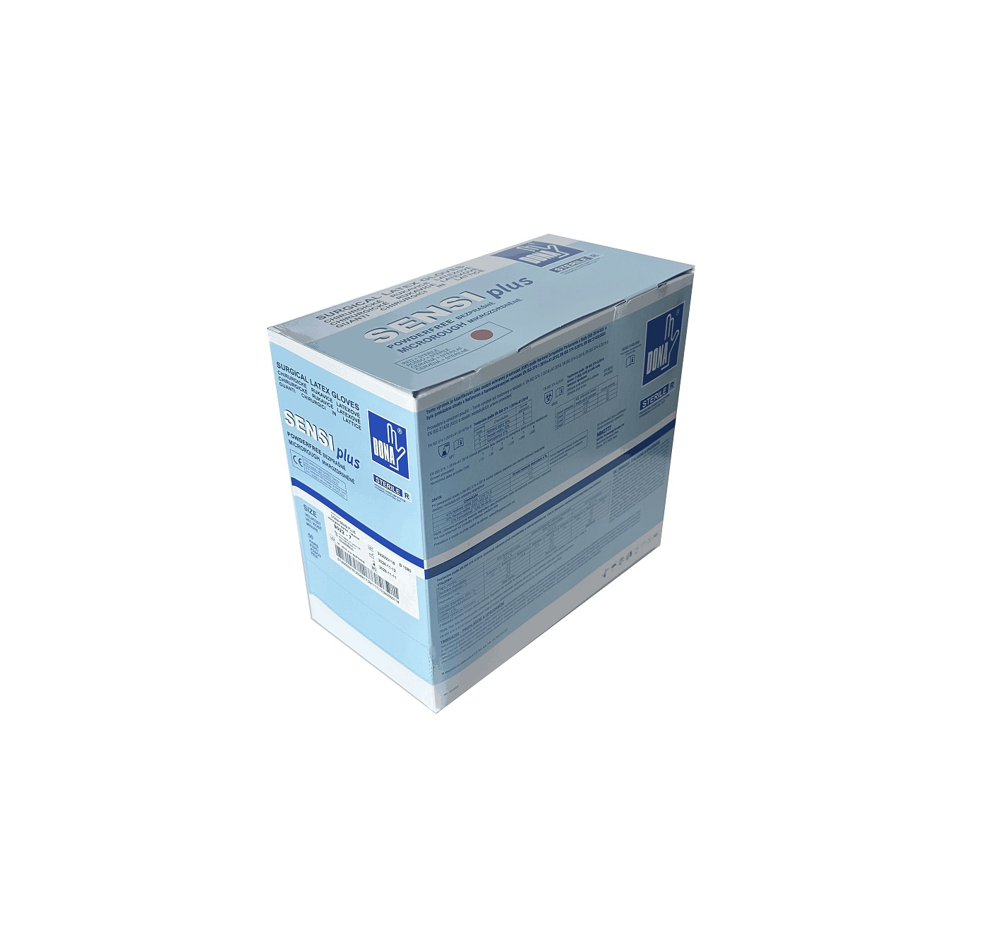 Rukavice Dona SensiPlus sú sterilné bezprašné (bezpudrové) operačné rukavice, transparentnej farby s jemne textúrovaným povrchom a rolovanou manžetou. Vyrobené sú z prírodného latexu. Sú plne anatomicky prispôsobivé, potiahnuté polymérom na vnútornej stene pre jednoduché navliekanie, vysoko rezistentné proti roztrhnutiu. Polymér slúži aj ako oddelenie latexu (potenciálneho alergénu) od pokožky rúk.