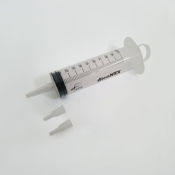 Sterilná trojdielna výplachová striekačka DicoNEX bez latexu s vysokou tesnosťou. Vyrobené z polypropylénu.