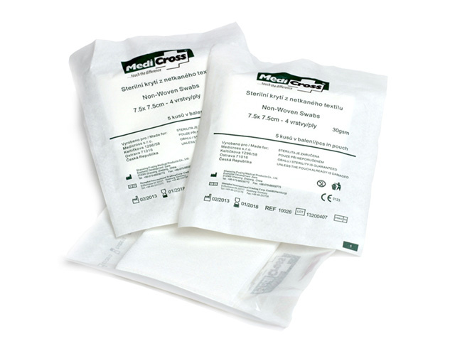 Sterilkompres - sterilný, 8 vrstiev, rozmer: 7,5 cm x 7,5 cm balené v blistri po 2 kusoch, v boxe sa nachádza 25 blistrov, v kartóne 20 boxov = 500 blistrov