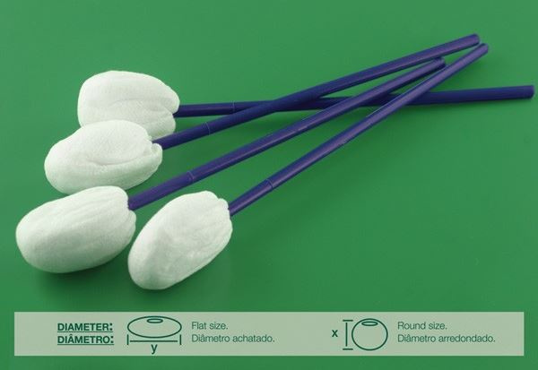 Tampón z netkanej textílie (viskóza a polyester) a plastová tyčinka, dĺžka 220 mm.