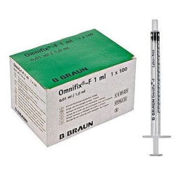 • OMNIFIX®-F DUO - 1 ml. Injekčná striekačka a ihla 25G (0.5×16, ihla STERICAN, kód 4657853). Umiestnenie konektora Luer: centrálne (v strede valca)