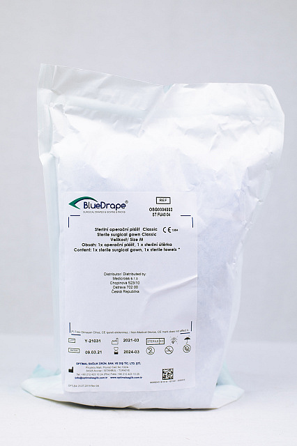 Sterilný operačný plášť zavinovací s 2-mi úväzkami, vyrobený z netkanej textílie zo 4-vrstvového materiálu SMMS o sile 40g/m2. Konce rukávov sú opatrené úpletom.