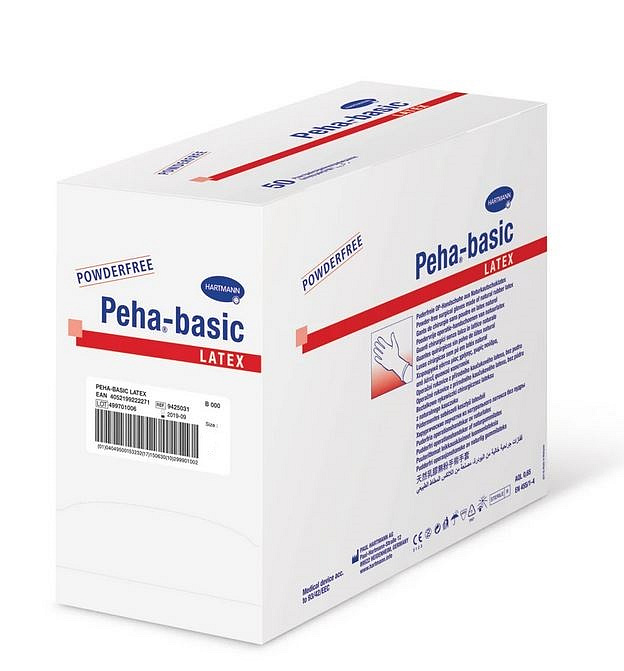 Peha-basic sú bezpudrové rukavice vyrobené z prírodného latexu. Majú plne anatomický tvar, hladký povrch a zosilnenú manžetu. Sú vysoko pružné a odolné proti roztrhnutiu. Chlórovaná vnútorná vrstva zabezpečuje jednoduché navliekanie.