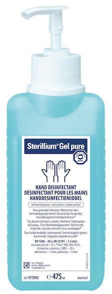 Bode Sterillium Gel pure je výrobok na báze alkoholu na hygienickú a chirurgickú dezinfekciu rúk s vynikajúcou starostlivosťou o pokožku. Alkoholový dezinfekčný prostriedok na ruky na použitie kdekoľvek bez ohľadu na dostupnosť umývadla alebo vody.