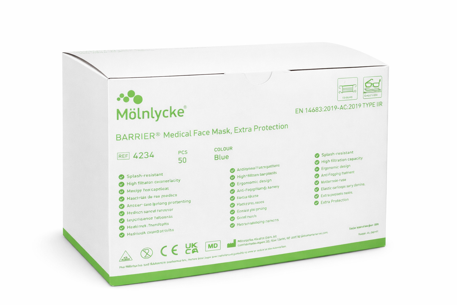 Mölnlycke BARRIER® Medical Face Mask, Extra Protection je kvalitná jednorazová zdravotnícka rúška určená pre profesionálne použitie v zdravotníckych zariadeniach. Spĺňa požiadavky normy EN 14683:2019+AC:2019 – Typ IIR, vrátane odolnosti proti postreku, a poskytuje spoľahlivú ochranu zdravotníckeho personálu aj pacientov.